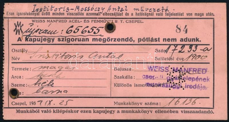 1937 A csepeli Weiss Manfréd Művek fényképes kapujegye művezető részér... https://www.darabanth.com/de/371-Fernauktion/371.0/Kunst-Dokumente-andere-Sammelgebiete/Dokument~500017/1937-A-csepeli-Weiss-Manfred-Muvek-fenykepes-kapujegye-muvezeto-reszere-szep-allapotban~II2165589