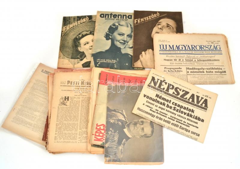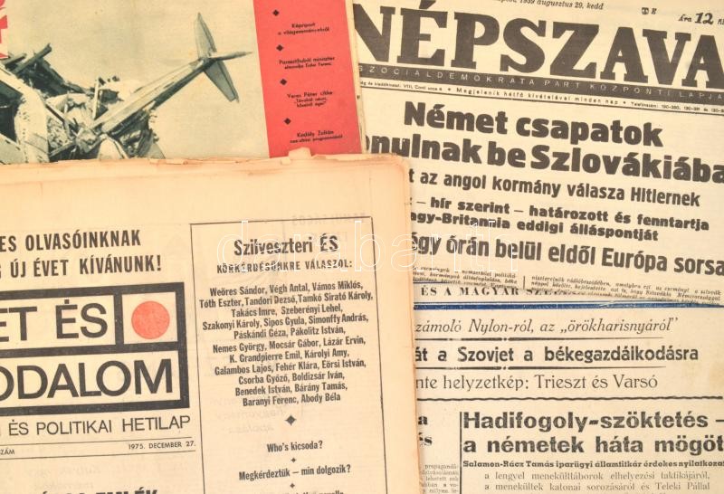 cca 1928-1975 Vegyes nagy újság és folyóirat tétel: Népszava, 1939. aug. 29., kedd, címlapon a német csapatok bevonulása Szlovákiába. Gong, SZOT Ökölvívó Szakbizottságának tájékoztatója, 1954. nov. Képes Vasárnap több száma, egyikén Horthy Miklós kormányzóval a címlapon. Vasárnapi Ujság több száma, többek közt az Eucharisztikus Kongresszus megnyitó ünnepsége a Hősök-terén a címlapon. Pesti Hirlap Vasárnapja, 1928, 4 száma, többek közt Fedák Sári írásaival. Képes Világ 3 száma, 1945-ből. Fényszóró 2 száma 1945-ből, Gobbi Hilda és Kiss Manyi a címlapon, stb.
