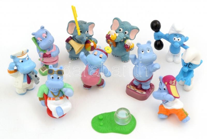 Beschreibung: Kinder és egyéb figurák (Happy Hippo, Nyaraló elefántok, Hupikék törpikék), 10 db