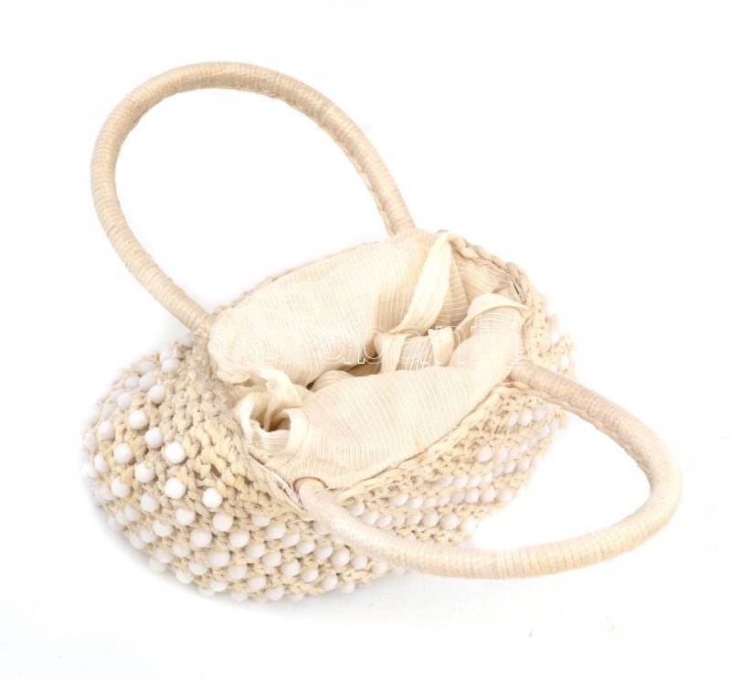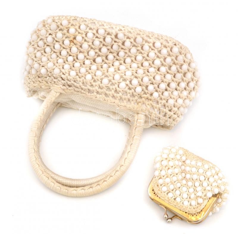 Beschreibung: Retro női fonott kézitáska és pénztárca, műanyag gyöngy utánzatokkal díszítve, kisebb foltokktal, kopásnyomokkal, h: ca. 23 cm és 9 cm