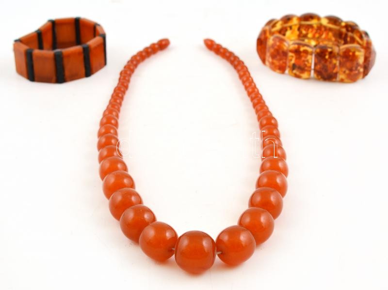 Beschreibung: Vegyes bizsu tétel: borostyán nyaklánc és karkötők, összesen 3 db, dobozkában