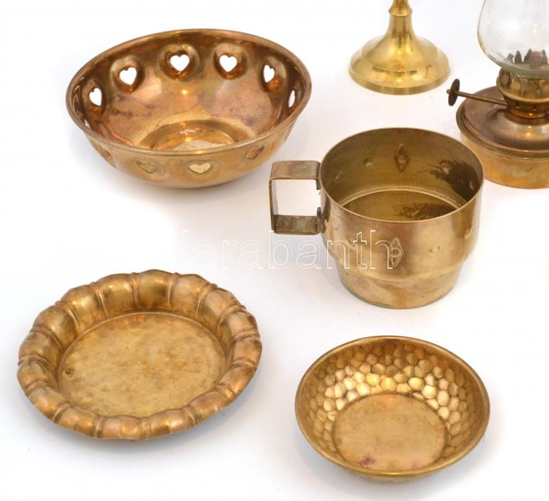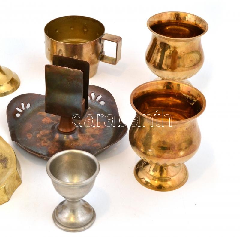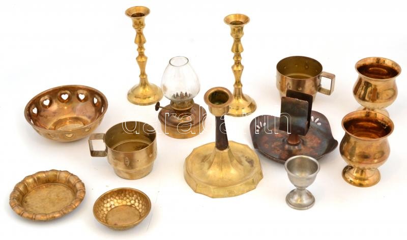 Beschreibung: Vegyes réz tárgy tétel, 13db (gyertyatartó, kehely, tálka, olajlámpa)