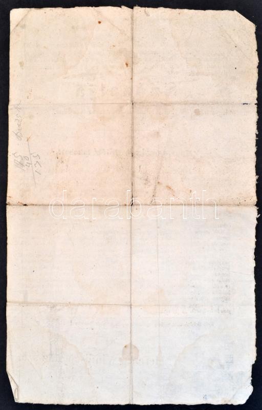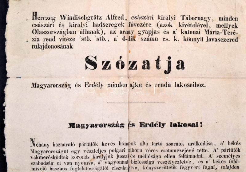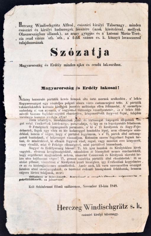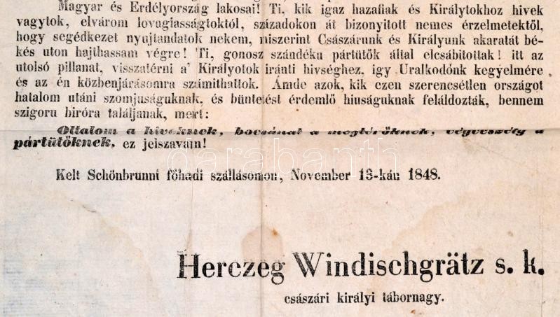 1848. november 13. Windischgrätz tábornok magyar nyelvű hirdetménye a magyarországi lakosokhoz szól és engedelmességre szólítja fel őket. "Oltalom a híveknek, bocsánat a megtérőknek, végveszély a pártütőknek, ez a jelszavam!" Winidsgrärtz hadjárata sikers volt ugyan, de hamar győzelmet hirdetett, és ezzel lehetőséget adott a magyar seregek összevonására és sikeres ellentámadásokra a következő év elején. Hajtva 25x40 cm. Ritka! / 1848 Proclamation Feldmarshall Windischgraetz to the Hungarian uprising people 25x40 cm