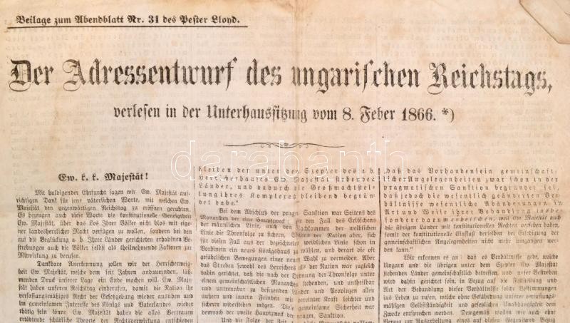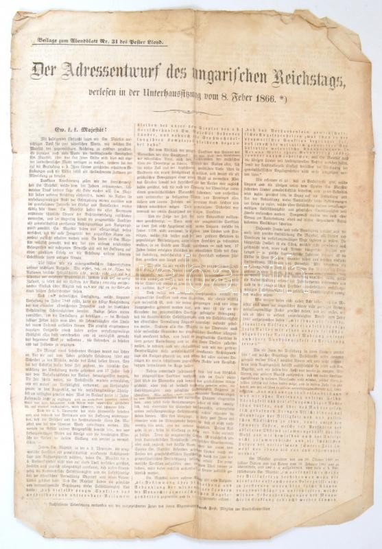 Beschreibung: 1866. február 22. A Magyar Országgyűlés felirati javaslata az uralkodóhoz az alkotmányosság helyreállításáért. Deák Ferenc javaslata a Pester Lloydban. Hajtva