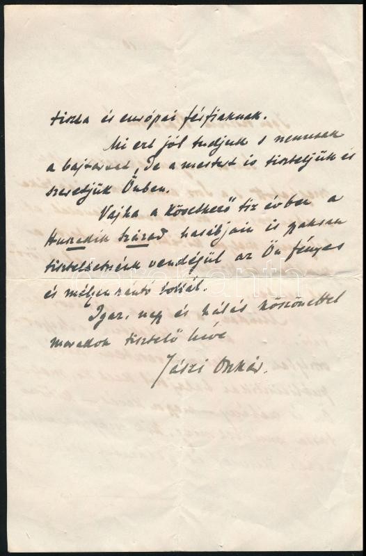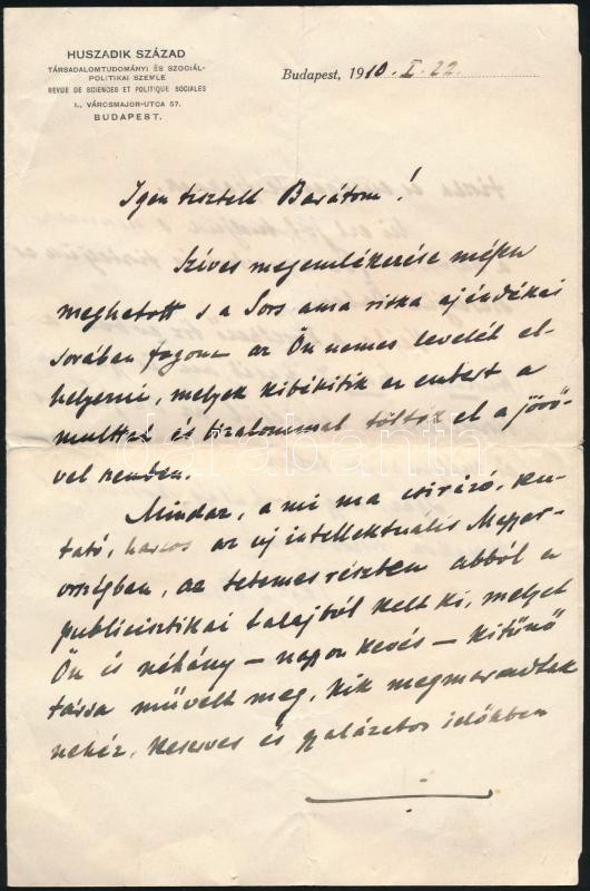 1910 Jászi Oszkár (1875-1957.) társadalomtudós, szabadkÅ‘műves, politikus, késÅ‘bb a Magyar Nemzeti Tanács tagja, a Károlyi-kormány minisztere saját kézzel Ãrt köszönÅ‘ levele GerÅ‘ Ödön (1863-1939) Ãró, újságÃró, esztétának "Igen tisztelt barátom!" megszólÃtással, válaszul a Huszadik Század folyóirat tÃz éves jubileumára Ãrt köszöntésére. "Mindaz, a mi ma csÃrázó, kutató, harcos az új intellektuális Magyarországban, az tetemes részben abból a publicisztikai talajból kelt ki, melyet Ön és néhány - nagyon kevés - kitűnÅ‘ társa művelt meg, kik megmaradtak nehéz keserves, gyalázatos idÅ‘kben európai férfiaknak" Jászi a levélben kifejezi óhaját, hogy "Vajha a következÅ‘ tÃz évben a Huszadik század hasábjain is gyakran tisztelhetnénk vendégül az Ön fényes és mélyen szántó tollát". Két beÃrt oldalon. A Huszadik Század fejléces levélpapÃrján.