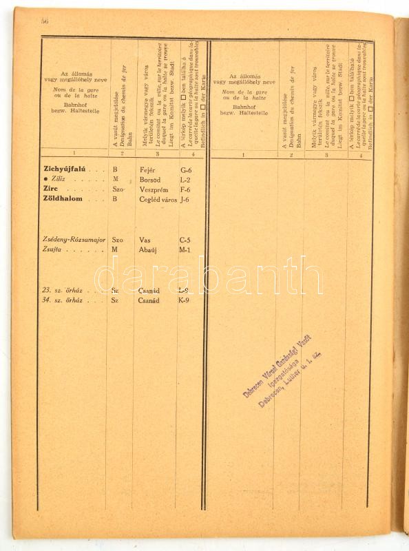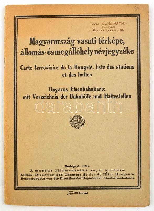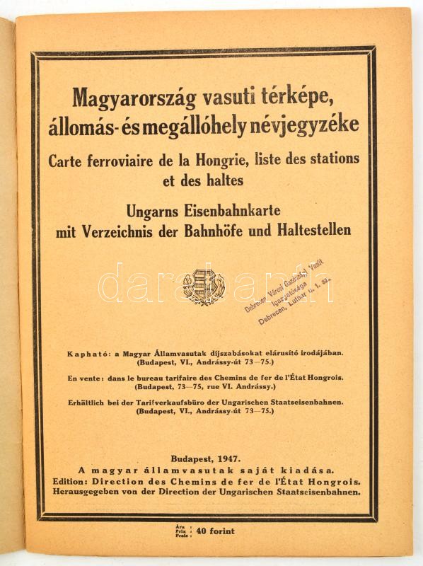 1947 Magyarország vasuti térképe, állomás és megállóhely névjegyzéke. Bp., 1947., MÁV, (Szikra-ny.),56 p. Magyar, francia és német nyelven. Korabeli reklámokkal. Magyarország vasuti térképe, 1:500.000, Bp., Klösz Gy.-ny., intézményi bélyegzővel, 79x115 cm