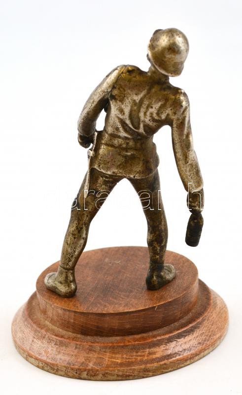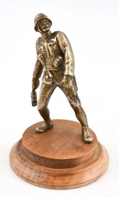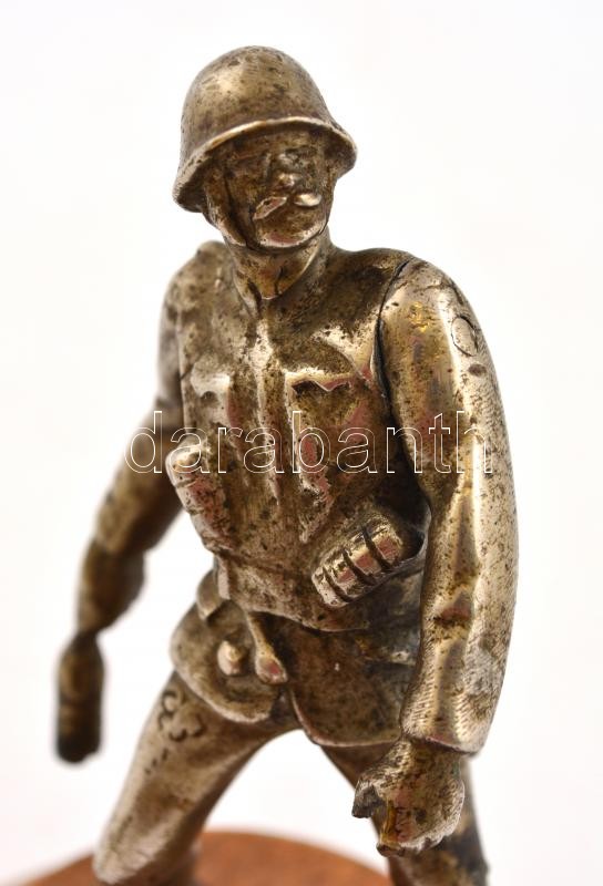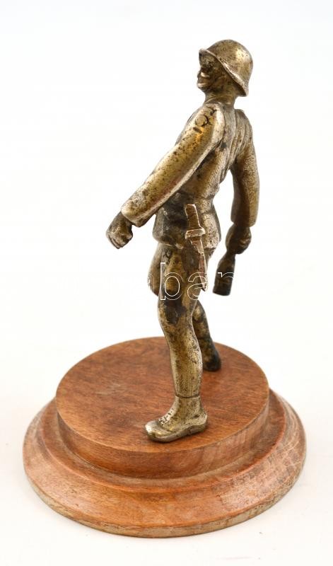 I. világháborús Monarchiás rohamcsapat katona fém figura szobor, fa talapzaton, jelzés nélkül, kopásnyomokkal, m: 11 cm (talapzattal együtt) / I. World War commando soldier metal sculpture, on wooden pedestal, not marked, with some creases, height: 11 cm (with pedestal)
