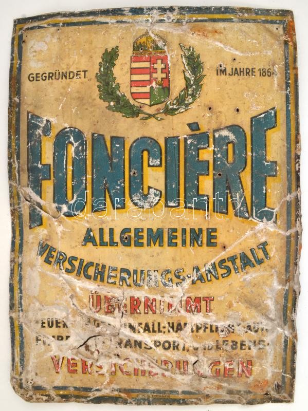 Fonciére, német nyelvű zománcozott fém tábla, erősen kopott, rozsdás, ... https://www.darabanth.com/de/371-Fernauktion/371.0/Kunst-Dokumente-andere-Sammelgebiete/Werbungen~500021/Fonciere-nemet-nyelvu-zomancozott-fem-tabla-erosen-kopott-rozsdas-hullamos-serult-a~II2167588