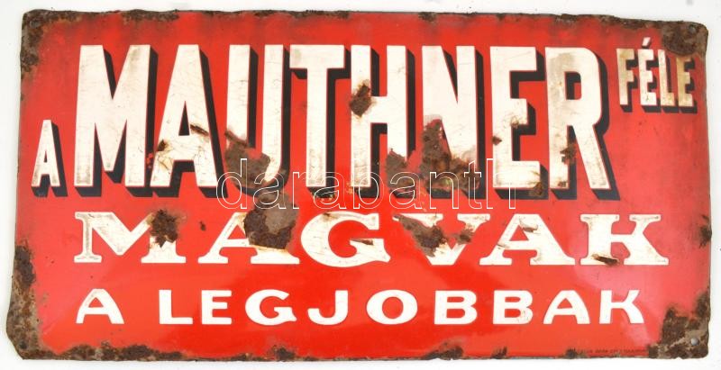 Mauthner féle magvak, zománcozott fém tábla, erősen rozsdás állapotban... https://www.darabanth.com/de/371-Fernauktion/371.0/Kunst-Dokumente-andere-Sammelgebiete/Werbungen~500021/Mauthner-fele-magvak-zomancozott-fem-tabla-erosen-rozsdas-allapotban-25-5C39750-cm~II2167616