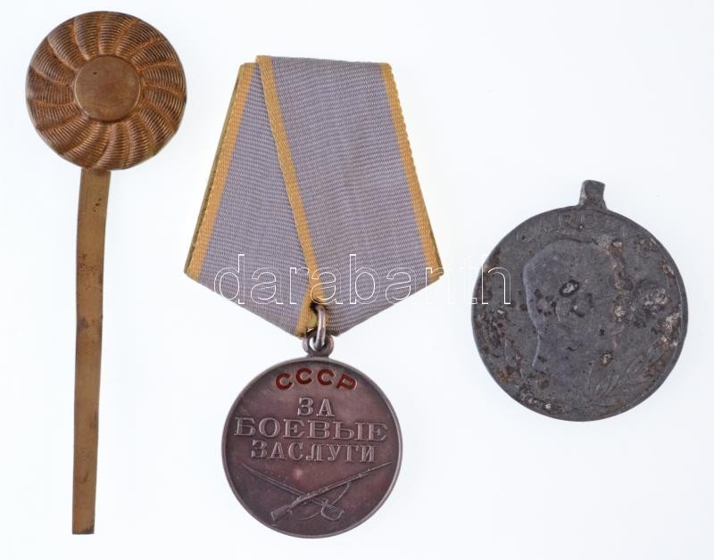 Beschreibung: 1918. "Laeso Militi" - Sebesültek Érme Zn kitüntetés mellszalag nélkül + Szovjetunió DN "Katonai érdemekért" fém kitüntetés mellszalagon + DN Br jelvény (28mm) T:2-