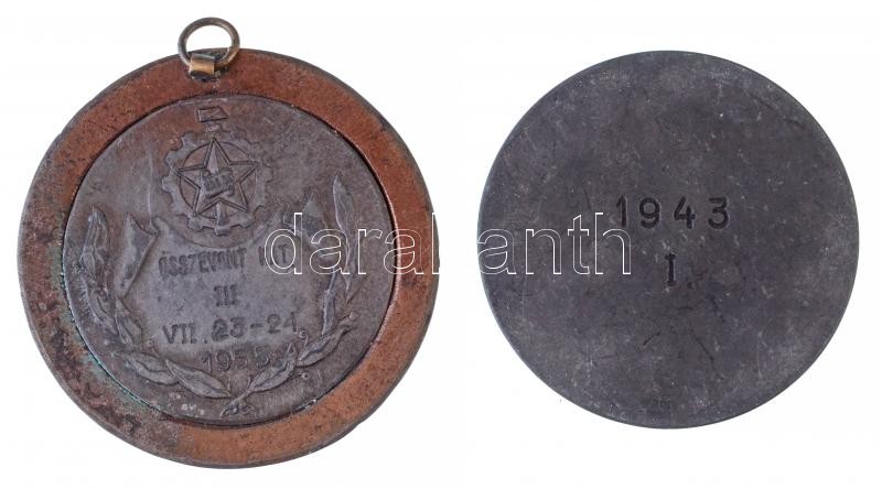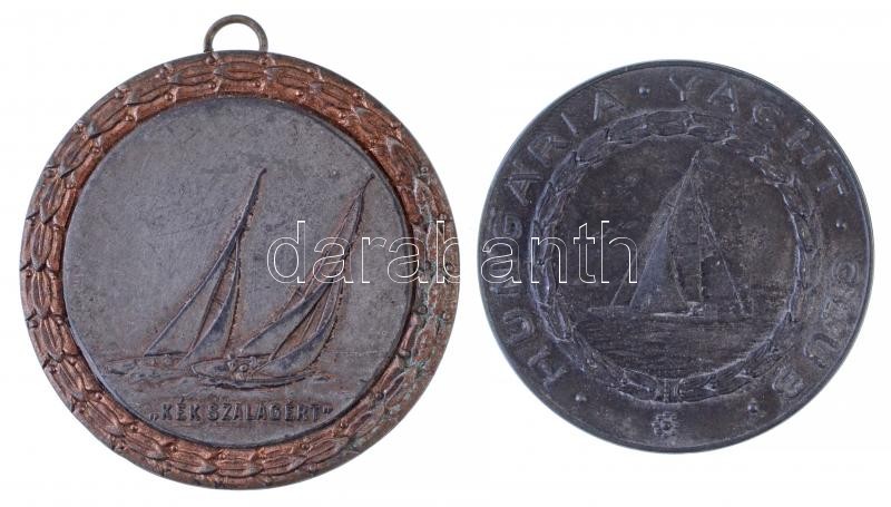 Beschreibung: 1943. "Hungária Yacht Club / 1943. I." Zn díjérem "Berán N BPest" gyártói jelzéssel (45mm) + 1955. "Kék Szalagért / Összevont kat. III. VII.23-24 1955" bronzozott Zn díjérem (50mm) T:2,2-