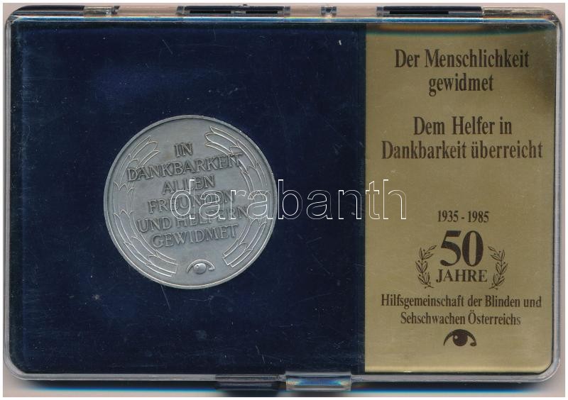 Ausztria 1985. "IN DANKBARKEIT ALLEN FREUNDEN UND HELFERN GEWIDMET / HILFSGEMEINSCHAFT DE BLINDEN UND SEHSCHWACHEN ÖSTERREICHS - 1935-1985 50 JAHRE MENSCHLICHKEIT UND NACHSTENLIEBE" ezüstpatinázott Br emlékérem, eredeti műanyag dísztokban (40mm) T:1 kis ph.