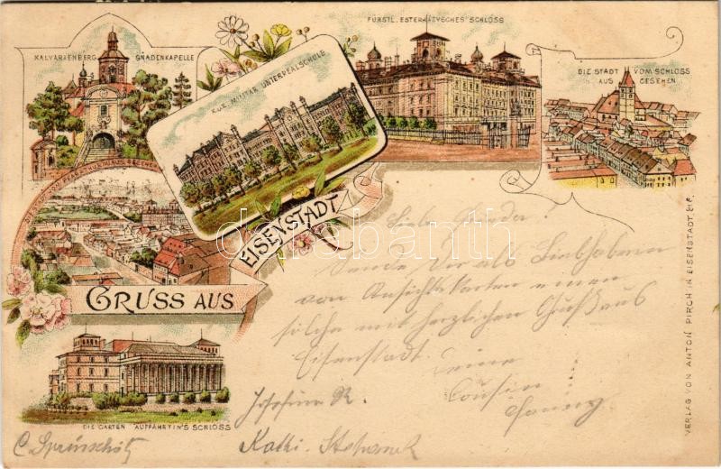 1898 Kismarton, Eisenstadt; K.u.K. Militär Unterrealschule, Kalvarienberg Gnadenkapelle, Die Garten Auffährtin's Schloss, Fürst. Esterházysches Schloss / katonai alreáliskola, Kálváriahegyi kápolna, kastélyok / military school, calvary chapel, castles. Anton Pirch Art Nouveau, floral, litho