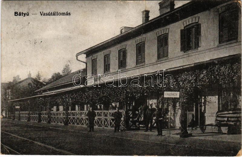 Beschreibung: 1916 Bátyú, Batyovo, Batovo, Batiovo; vasútállomás, "Királyháza" tábla és vasutasok. Vasúti Levelezőlapárusítás 3120. / Bahnhof / railway station, railwaymen (szakadás / tear)