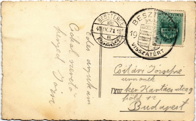 Beschreibung: 1940 Beszterce, Bistritz, Bistrita; Primaria, Dermata / Városháza, Fekesházy üzlete, bank / town hall, shops, street view, bank. photo + "1940 Beszterce visszatért" So. Stpl. (EB)