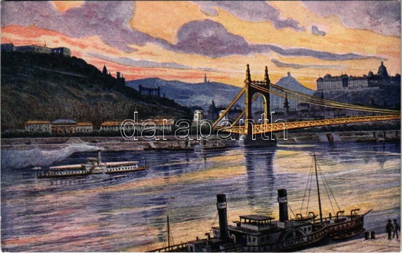 Budapest, Esti hangulat a Dunán, Erzsébet híd, gőzhajók (EK) https://www.darabanth.com/de/372-Fernauktion/372.0/Ansichtskarten/Ungarn~2000005/Budapest-Esti-hangulat-a-Dunan-Erzsebet-hid-gozhajok-EK~II2174288
