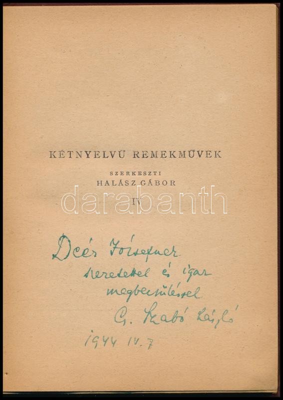 Conrad Ferdinand Meyer válogatott versei. Ford.: Kosztolányi Dezső, Radnóti Miklós, Rónay György, Sárközi György, Szabó Lőrinc és Vargha Gyula. Cs. Szabó László bevezetőjével. Kétnyelvű Remekművek IV. köt. Bp.,[1943], Franklin, 125+3 p. Magyar és német nyelven. Kiadói kopott egészvászon-kötésben, kissé sérült gerinccel, Dr. Dajbukát Gergely ex libris-szével. A bevezető írójának, Cs. Szabó László (1905-1984) író, esszéíró, kritikus ajándékozási soraival, dedikációjával Deér Józsefnének, Deér József (1905-1972) történész egyetemi tanár feleségének, dátumozva (1944. IV. 7.)