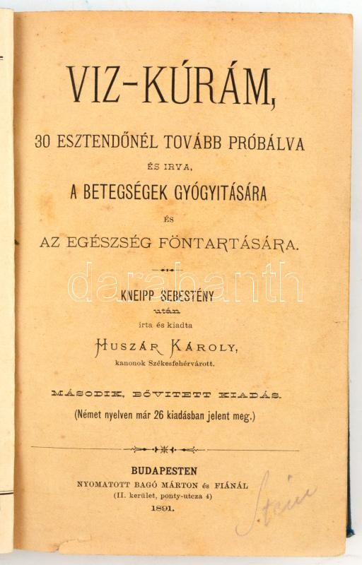 Kneipp Sebestyén: Víz-kúrám, 30 esztendőnél tovább próbálva és írva a betegségek gyógyítására és az egészség föntartására. Kneipp Sebestyén után írta és kiadta Huszár Károly. Bp., 1891, Bagó Márton és Fia. Második, bővített kiadás. Kiadói egészvászon-kötés, kopott, sérült borítóval, de belül jó állapotban.