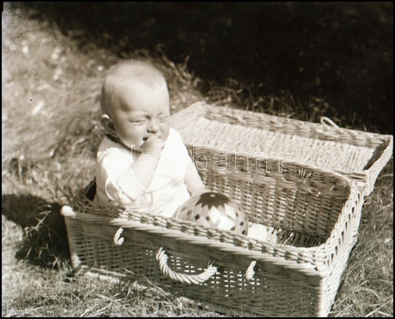 Beschreibung: cca 1935 Thöresz Dezső (1902-1963) békéscsabai gyógyszerész és fotóművész hagyatékából vintage NEGATÍV (Gyermek piknik kosárban), 6x9 cm