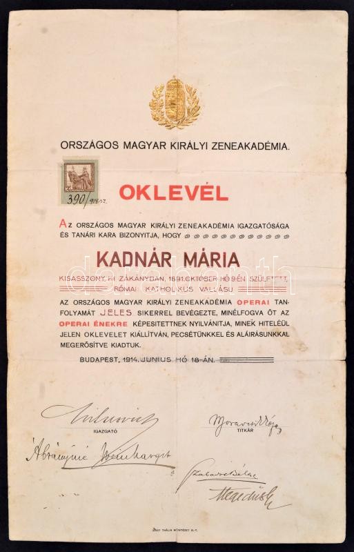 1914 Bp., Operai énekessé képesítő oklevél, rajta Hegedűs Gyula, Szaba... https://www.darabanth.com/de/372-Fernauktion/372.0/Kunst-Dokumente-andere-Sammelgebiete/Dokument~17/1914-Bp-Operai-enekesse-kepesito-oklevel-rajta-Hegedus-Gyula-Szabados-Bela-es-masok-al~II2172466