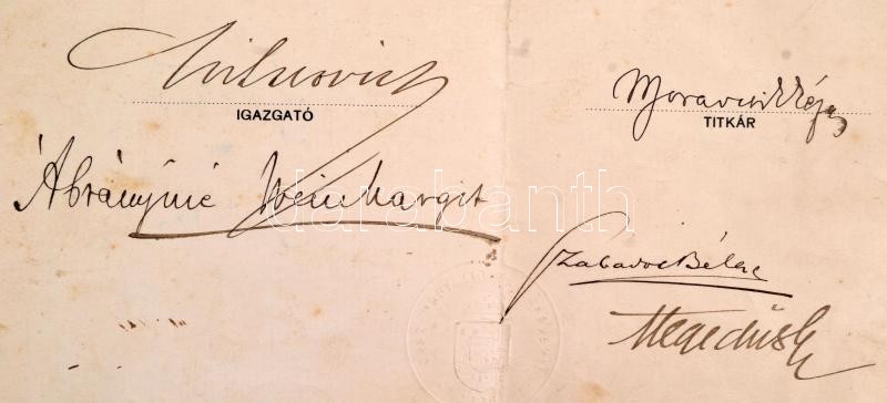 Beschreibung: 1914 Bp., Operai énekessé képesítő oklevél, rajta Hegedűs Gyula, Szabados Béla és mások aláírásával