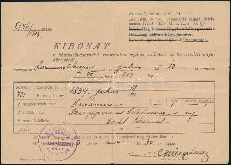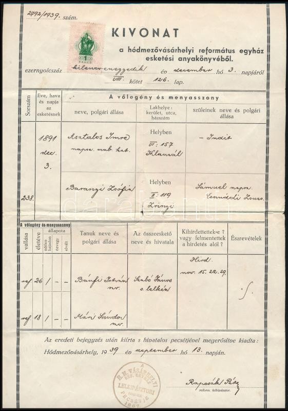 1915-1943 4 db hódmezővásárhelyi irat, közte esketési anyakönyvi kivon... https://www.darabanth.com/de/372-Fernauktion/372.0/Kunst-Dokumente-andere-Sammelgebiete/Dokument~17/1915-1943-4-db-hodmezovasarhelyi-irat-kozte-esketesi-anyakonyvi-kivonat-szuletesi-anyako~II2170364