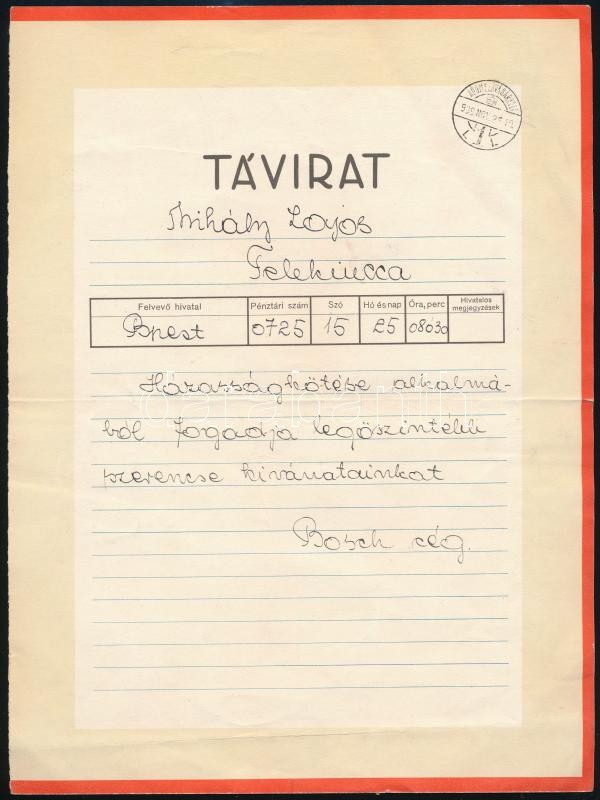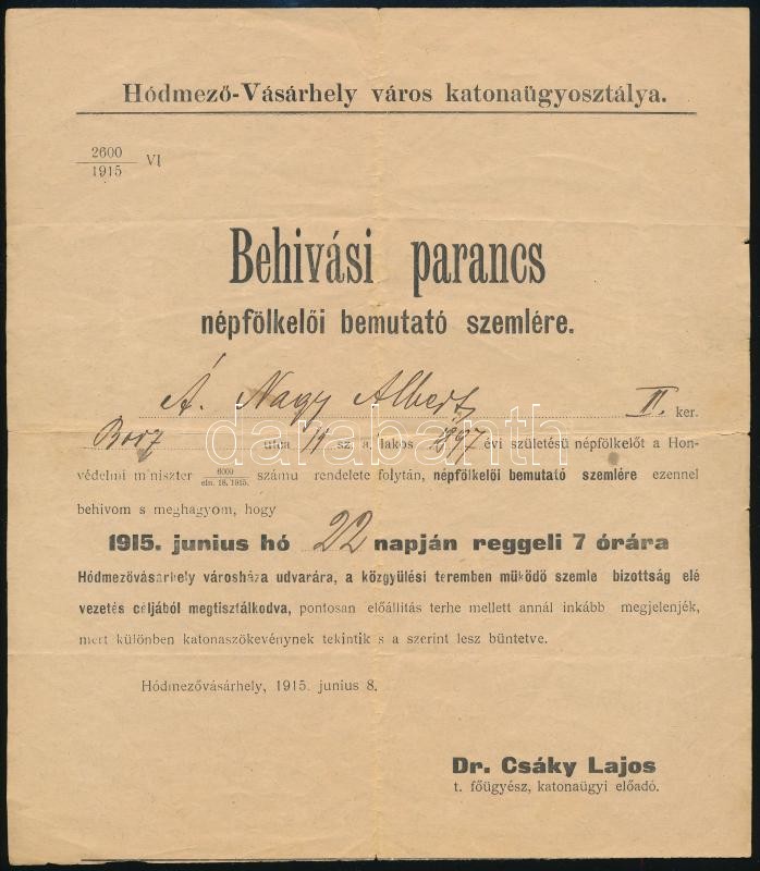 Beschreibung: 1915-1943 4 db hódmezővásárhelyi irat, közte esketési anyakönyvi kivonat, születési anyakönyvi kivonat, távirat és behívási parancs