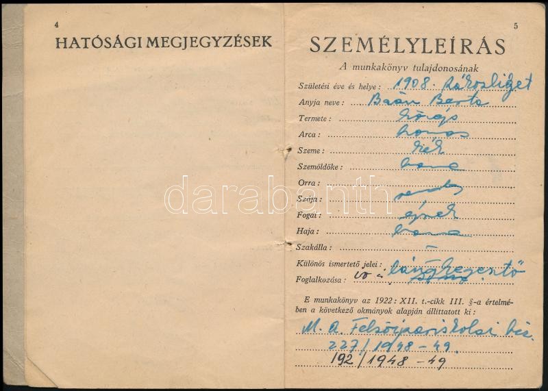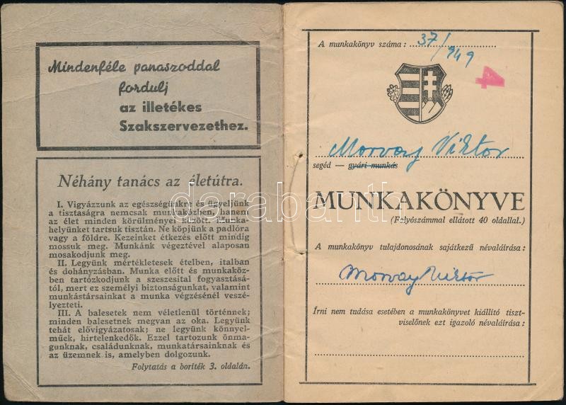 1949 munkakönyv Kossuth címerrel, lánghegesztő, majd Kőbányai Sörgyár ... https://www.darabanth.com/de/372-Fernauktion/372.0/Kunst-Dokumente-andere-Sammelgebiete/Dokument~17/1949-munkakonyv-Kossuth-cimerrel-langhegeszto-majd-Kobanyai-Sorgyar-alkalmazottja-kisse~II2168625