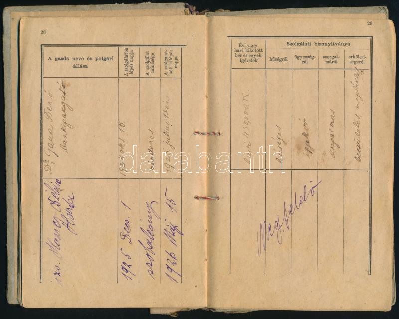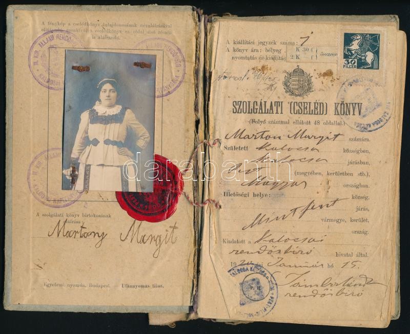 cca 1920-27 Fényképes cselédkönyv kalocsai szül. személy részére, sok ... https://www.darabanth.com/de/372-Fernauktion/372.0/Kunst-Dokumente-andere-Sammelgebiete/Dokument~17/cca-1920-27-Fenykepes-cseledkonyv-kalocsai-szul-szemely-reszere-sok-bejegyzessel-szetvC3~II2174488