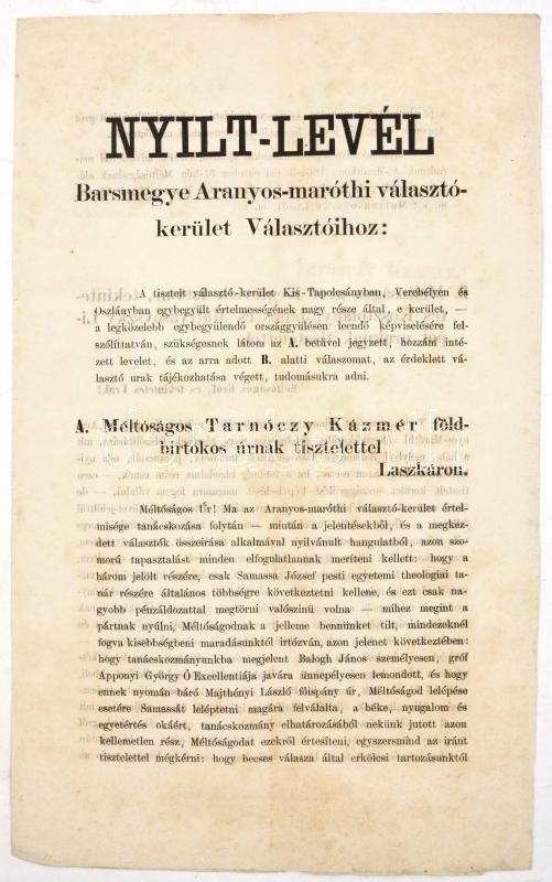 1865 Nyilt-levél Barsvármegye Aranyos-maróthi választókerület Választóihoz. A. Méltóságos Tarnóczy Kázmér birtokos úrnak tisztelettel Laszkáron. B. Méltóságos gróf Keglevich István, tekintetes Kosztolányi János és Mattyasovszky Lipót uraknak tisztelettel. Nyitra, 1865, Szigler testvérek-ny., 2 sztl. lev. Tarnóczy Kázmér (1804-1884) politikus, Bars vármegye országgyűlési képviselőjének nyílt levele, melyben a választói kérésnek (A.) eleget téve, maga helyett Apponyi György (1808-1899) politikus, nagybirtokos támogatására kéri Keglevich Istvánt, Kosztolányi Jánost, és Mattyasovszky Lipót urakat.
