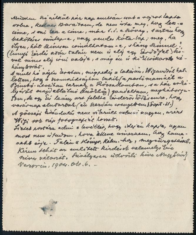 1904.X.6. Nagy Sándor (1868-1950) festő és grafikus, a Gödöllői Művésztelep alapító tagjának autográf levele a Könyves Kálmán kiadóhoz, Gerő Ödön szerkesztőnek, melyben kérdezi, hogy megküldendő rajzát milyen formátumban készítse el.