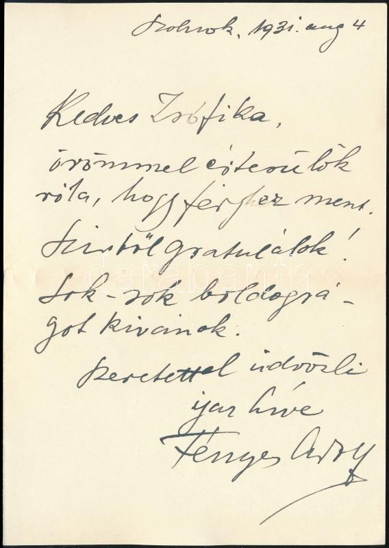 Beschreibung: 1931 Fényes Adolf (1867-1945) festőművész autográf levele Gerő Ödön kritikus lányának, Zsófiának Szolnokról, melyben gratulál hazásságához.