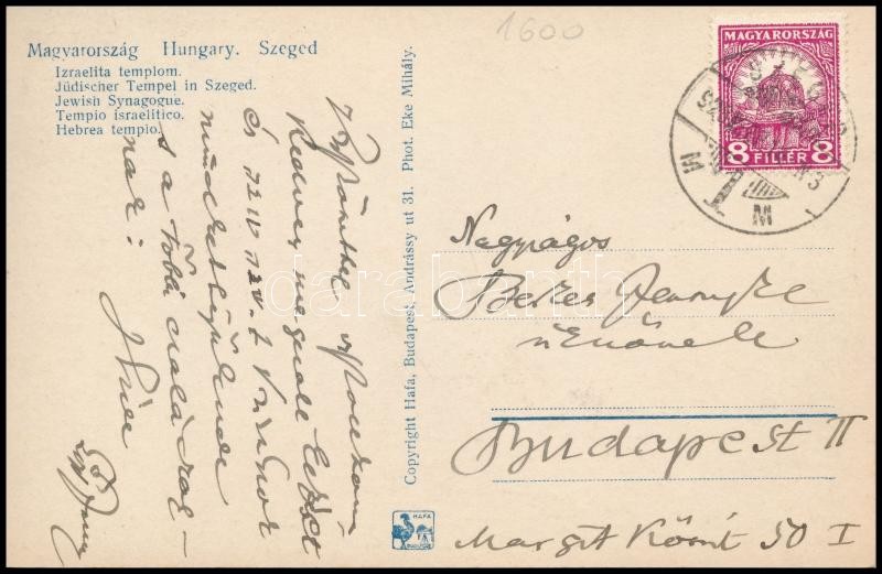 1928 Lőw Immánuel (1854-1944) magyarországi zsidó hittudós, 1878-tól haláláig, 66 éven keresztül szegedi főrabbi aláírása és részben héber nyelvű üdvözlő sorai, egy a szegedi zsinagógát ábrázoló képeslapon / Immanuel Löw, rabbi of Szeged in Hungary, autograph signature and partially hebrew greetings on a postcard showing the jewish synagogue in Szeged
