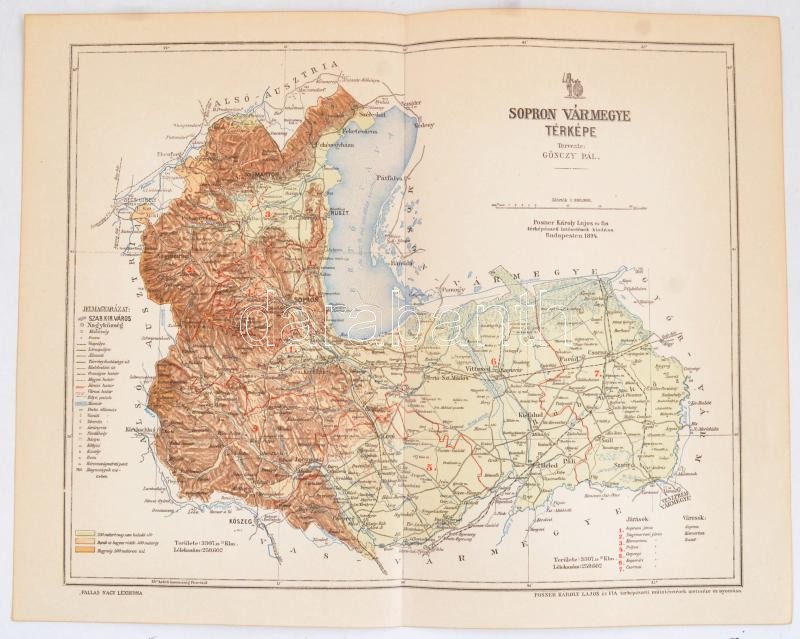 1894 Sopron vármegye térképe, tervezte: Gönczy Pál, Posner Károly Lajos és Fia térképészeti műintézetének metszése és nyomása, Pallas Nagy Lexikona, 1:380.000, 24×30 cm
