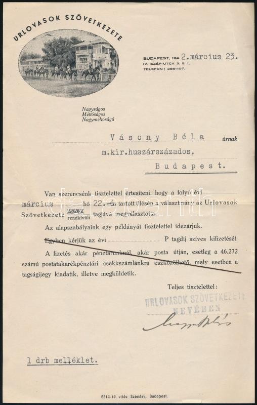 1942 Urlovasok szövetkezete által m. kir. huszárszázadosnak címzett le... https://www.darabanth.com/de/372-Fernauktion/372.0/Kunst-Dokumente-andere-Sammelgebiete/Militaria~27/1942-Urlovasok-szovetkezete-altal-m-kir-huszarszazadosnak-cimzett-level-amelyben-ertesiti~II2174521