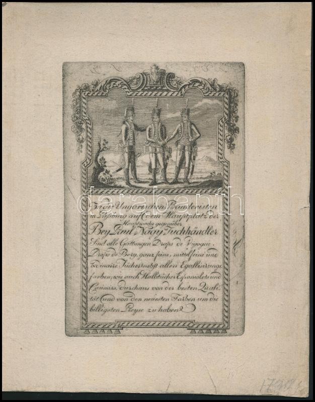 Beschreibung: cca 1800 Pozsony, Nagy Pál textilkereskedő felhívása a magyar katonákhoz, metszet, kartonra ragasztva, 17,5×11 cm