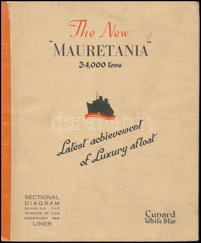 cca 1939-1940 Brochure of The new "Mauretania". Ocean liner of Cunard White Star Line, with black-and-white photographs, with the sectional plan of the ship, in English language.