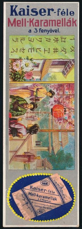 Beschreibung: Kaiser-féle Mell.karamellák, régi könyvjelző, litográfia, papír, 15x5 cm