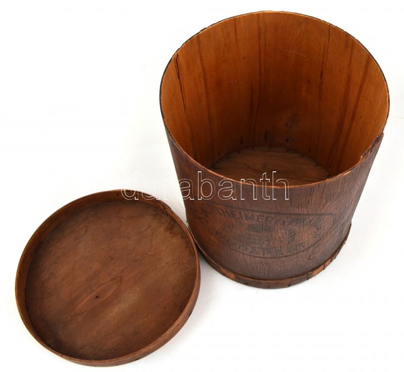 Beschreibung: Nagy méretű, régi, henger alakú Wertheimer és Frankl fa doboz fedéllel, magyar címerrel, kissé sérült, h: 34,5 cm, d. 31 cm