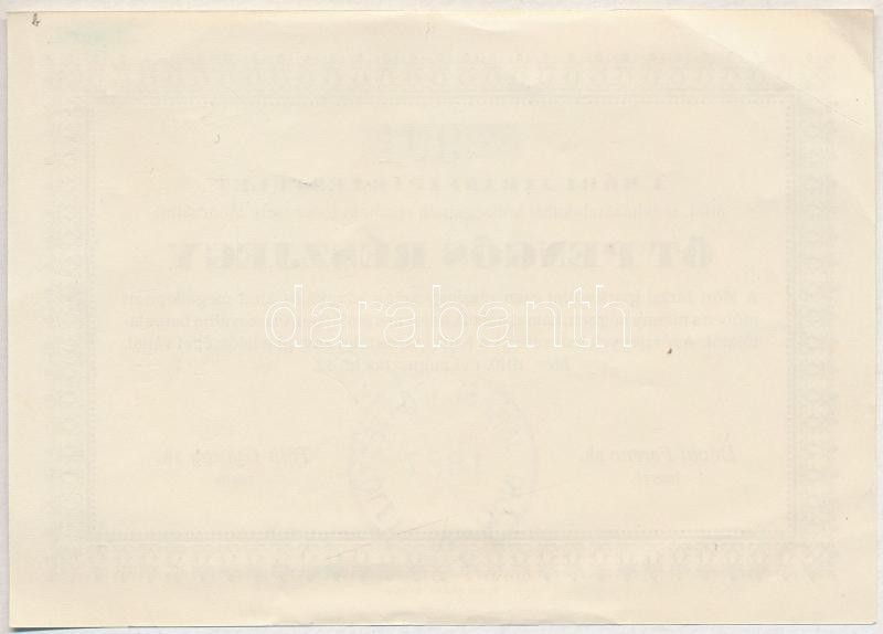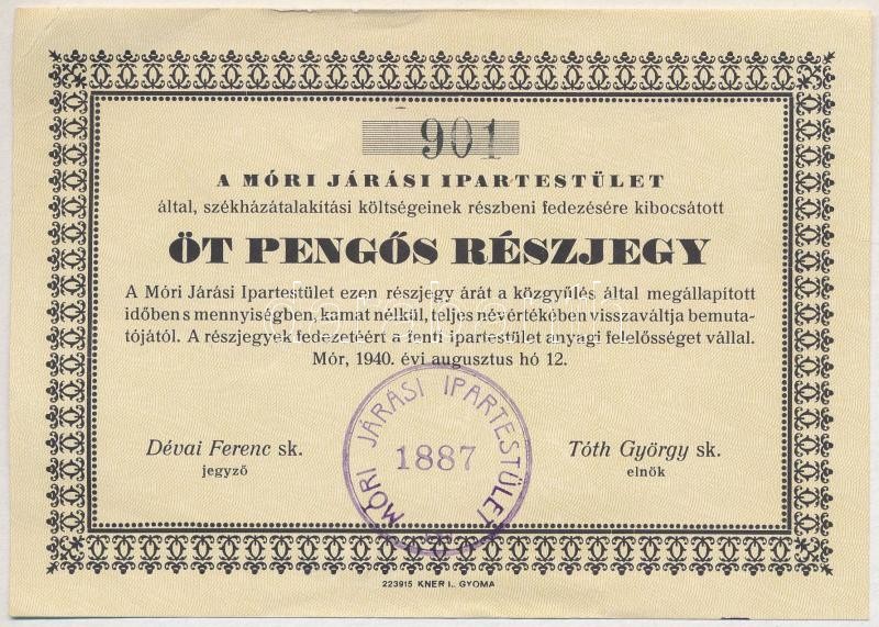 Beschreibung: 1940. "A Móri Járási Ipartestület" 5P névértékű részjegye, bélyegzéssel T:III szép papír