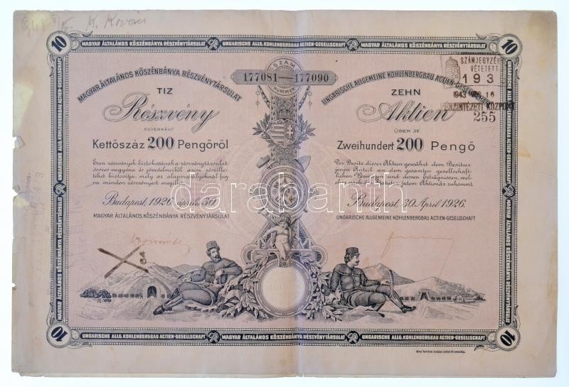 Budapest 1926. "Magyar Általános Kőszénbánya Részvénytársulat" tíz darab részvénye egyenként 200P-ről, kétnyelvű, szárazpecséttel és bélyegzéssel T:III szakadások