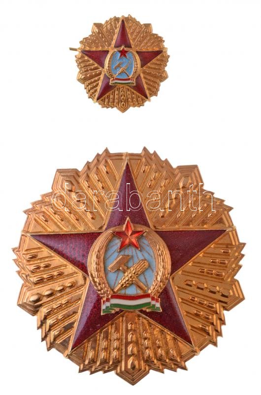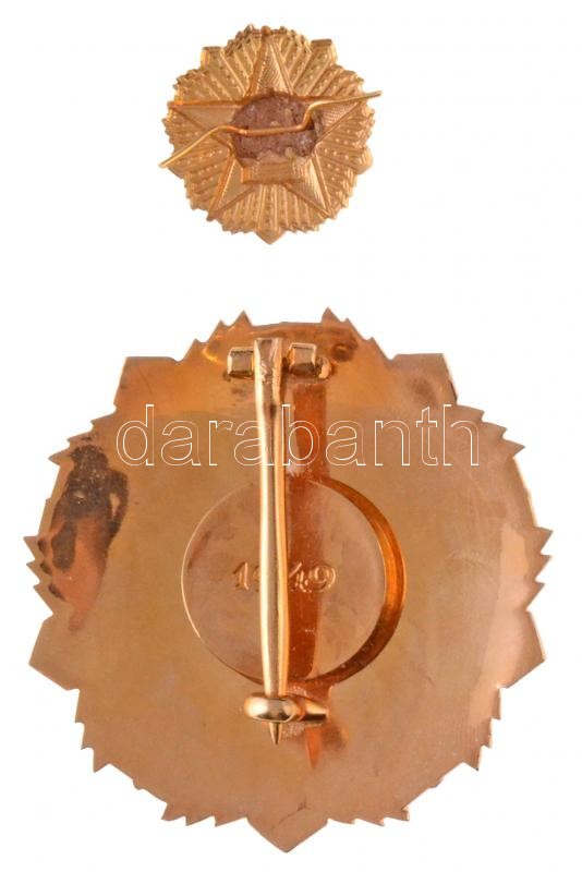 1949. "Magyar Népköztársasági Érdemrend II. fokozata" zománcozott, aranyozott Br kitüntetés, a tű MÁPV verdejel nélkül. Nem adományozott, feltehetően az 1980-as években a Pénzverőben készült példány (60mm) + A Magyar Népköztársasági Érdemrend I. fokozatának kisdíszítményéne, szalag nélkül (25mm) T:1-