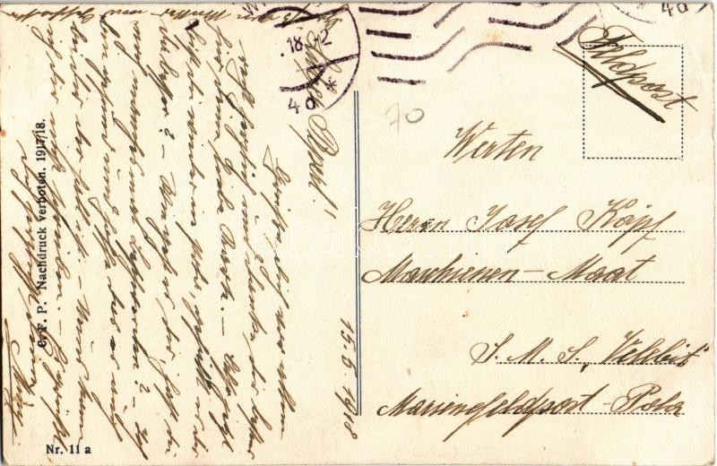 1918 Éjjeli matrózcsíny / Baldoria notturna / Nocna sala mornara / K.u.K. Kriegsmarine Ein nächtlicher Matrosenulk / WWI Austro-Hungarian Navy mariner humour art postcard, C. F. P. 1917/18. Nr. 11a. s: Ed. Dworak (fl)