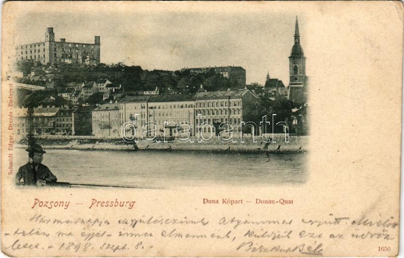 Beschreibung: 1898 Pozsony, Pressburg, Bratislava; Duna kőpart, rakpart, vár, templom. Schmidt Edgar kiadása / Donau-Quai / quay, castle, church (EK)