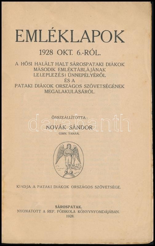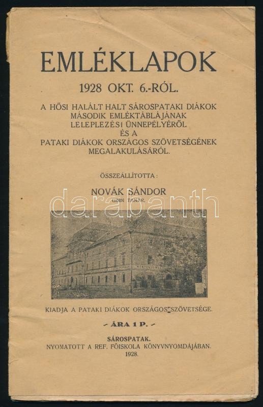 Emléklapok 1928. okt. 6.-ról. A hősi halált halt sárospataki diákok második emléktáblájának leleplezési ünnepélyéről és a pataki diákok országos szövetségének megalakulásáról. Összeállította: Novák Sándor. Sárospatak, 1928, Pataki Diákok Országos Szövetsége. Kiadói papírkötésben, kissé laza fűzéssel, felvágatlan.