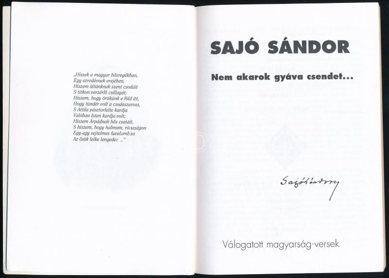 Sajó Sándor: Nem akarok gyáva csendet... Válogatott magyarság-versek. Vál.: Fejes Imre és Medvigy Endre. Szerk. és az előszót írta: Medvigy Endre. Bp., 2000, Ménrót. Kiadói kartonált papírkötés, jó állapotban.