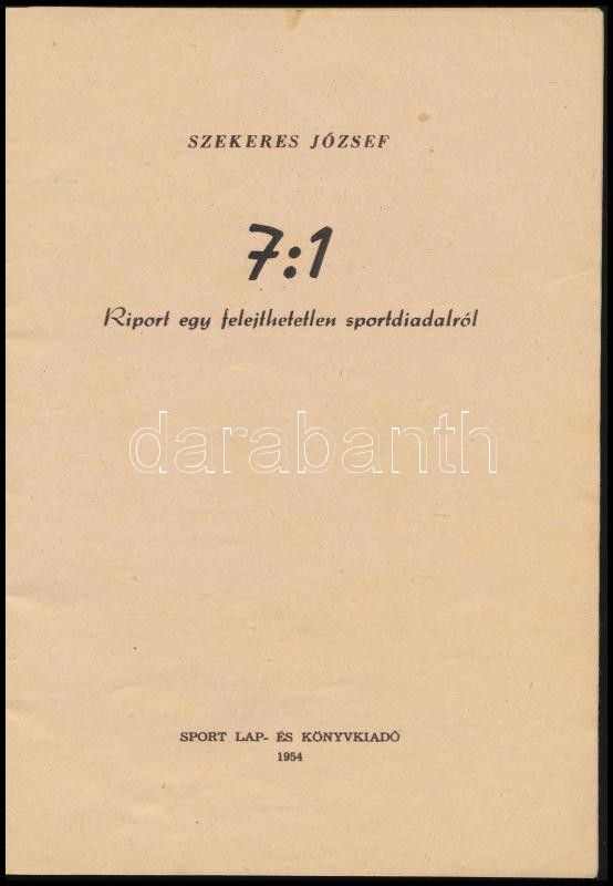Szekeres József: 7:1. Riport egy felejthetetlen sportdiadalról. Bp., 1954, Sport Lap- és Könyvkiadó. Kiadói papírkötés, kissé kopottas állapotban.