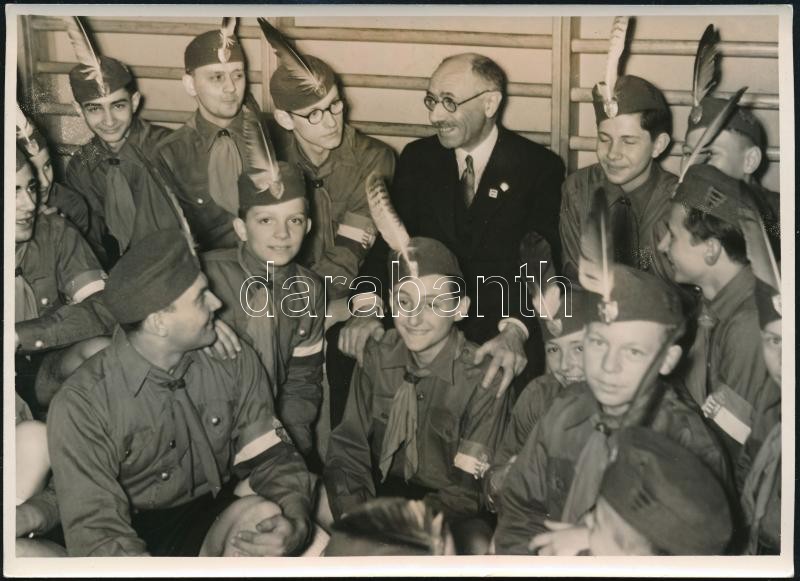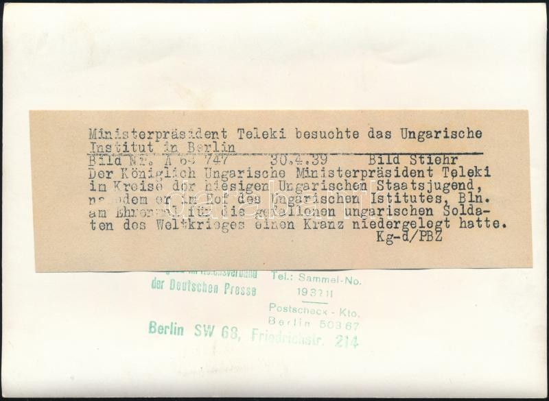 1939 Teleki Pál miniszterelnök a Berlini Magyar Intézetben leventékkel. Sajtófotó 18x13 cm / 1939 Pál Teleki Hungarian Prime Minister in the Berlin Collegium Hungaricum. Press photo, with german description on the back. 18x13 cm