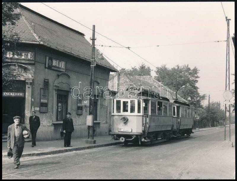 Beschreibung: cca 1960 Budapest, a Csömöri út és Rákóczi út kereszteződésénél a 69-es villamos, fotó, 16×22 cm