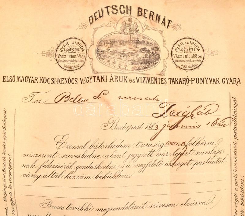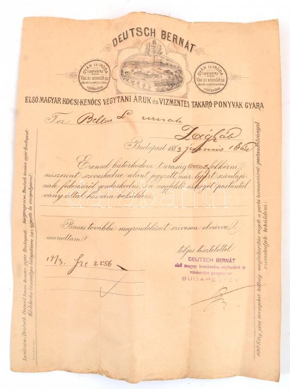 1883 Deutsch Bernát Első Magyar Kocsi-kenőcs Vegytani áruk és Vizmentes Takaró-Ponyvál Gyára, díszes fejléces számla, Zágrábi ügyfél részére, hajtásnyommal, egészen apró szakadásokkal